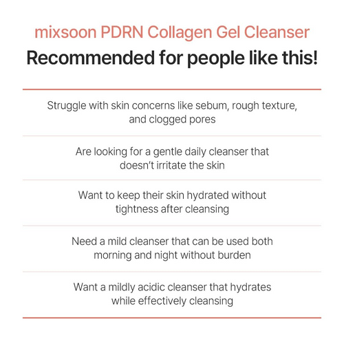Mixsoon PDRN Collagen Gel Cleanser: Strengthens skin barrier, boosts elasticity, brightens, hydrates, cruelty-free. Made in Korea.